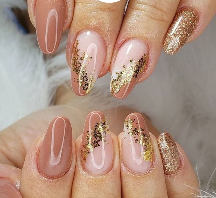 Simple nude nails are elevated with strategically placed gold foil, creating a look that is both deliberate and eye-catching. The application of the foil adds texture and shine while allowing the neutral base to remain the focal point.