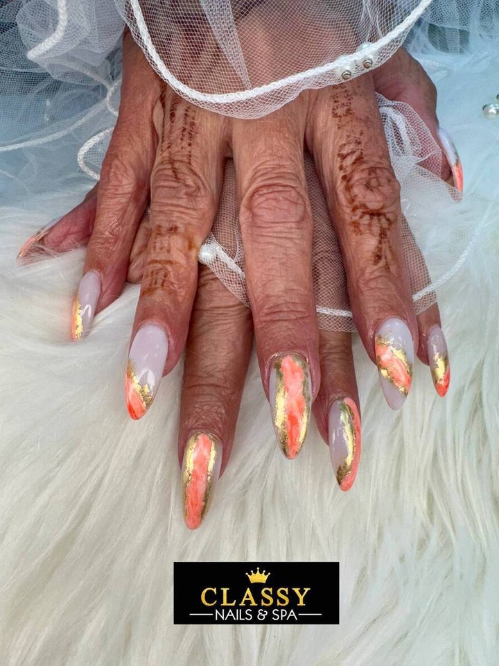 The graceful combination of a peachy nude shade with fluid gold accents is truly captivating. The metallic details appear almost hand-painted, lending the nails an organic and artistic finish.
