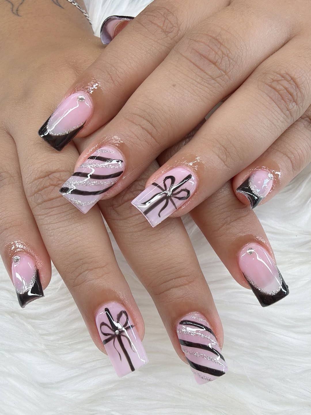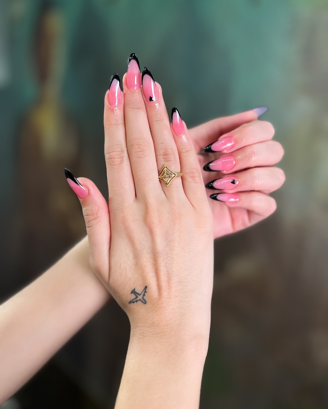This set masterfully plays with contrast. The soft pink base maintains a feminine appeal, while the black tips introduce a touch of edge, creating a captivating dynamic. It’s a harmonious blend of sweet and bold.