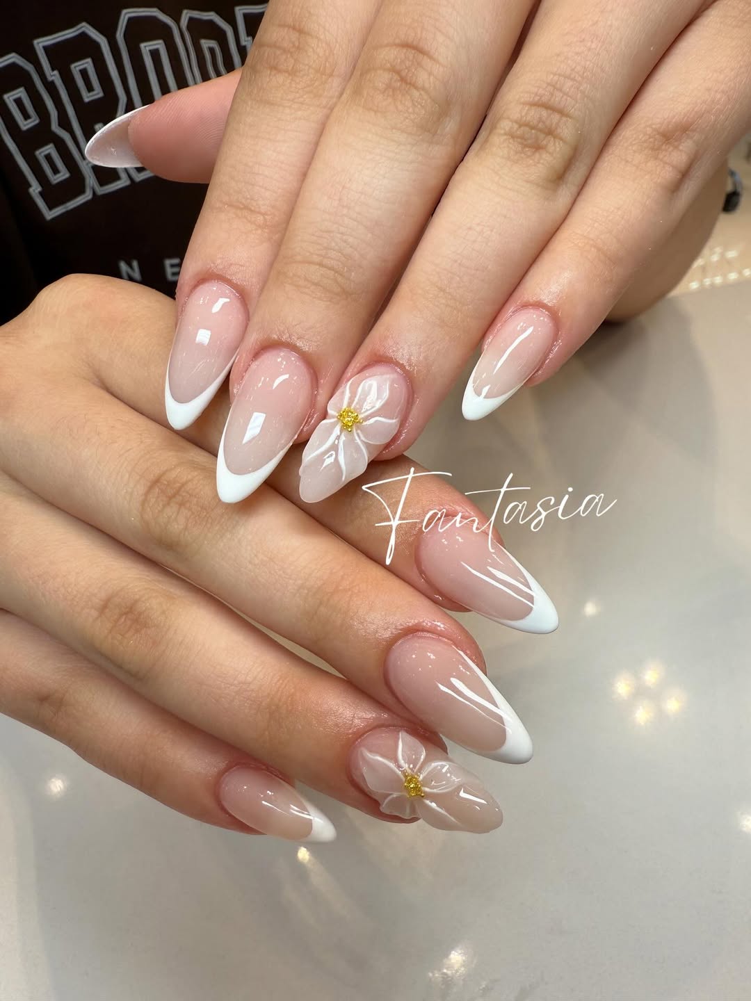 Classic French tips are harmonized with delicate floral motifs, resulting in a timeless yet romantic aesthetic. The crisp white tips maintain a clean look, while the floral embellishments beautifully soften the overall design.