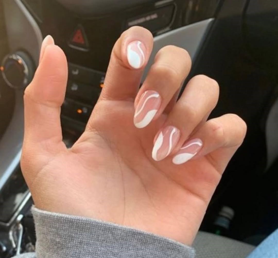 This set is serene, comforting, and subtly cool. The milky nude base featuring flowing white wave details offers an effortless feel, akin to a moment of calm for your manicure. The design is characterized by smooth movement, devoid of harshness.