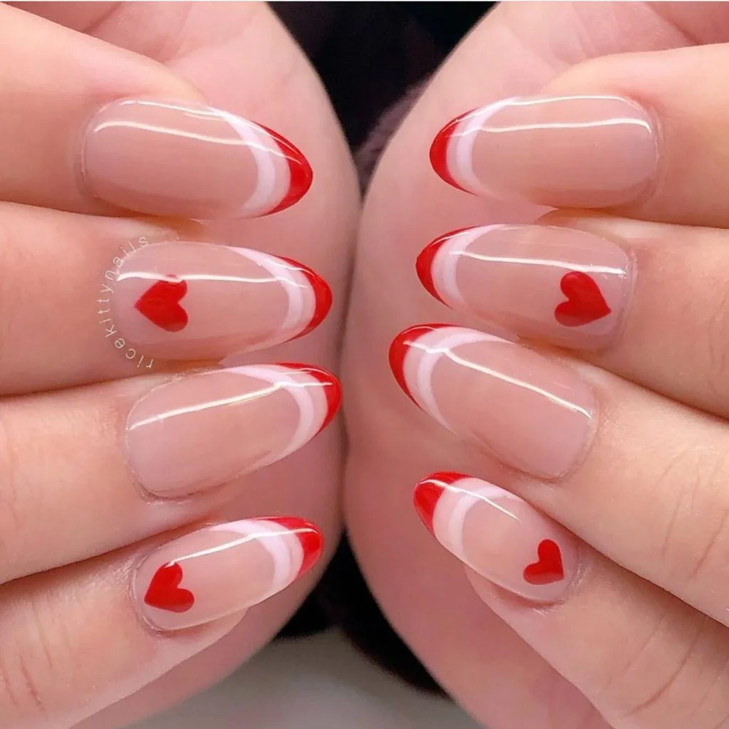 This design emphasizes the French tip with brighter reds and precise heart placements, conveying confidence and playfulness. The style is intentional and polished, avoiding any suggestion of messiness. It’s an excellent choice for festive yet clean-looking nails that photograph well and subtly express a Valentine’s theme.