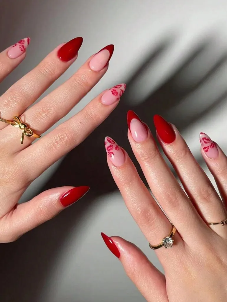Bold red French tips are paired with delicate floral accents, creating a look that feels both timeless and unique. The contrast between the crisp French line and the soft, almost hand-painted floral details adds depth and sophistication. This style is confident and feminine, perfect for those who appreciate tradition with a personal touch.