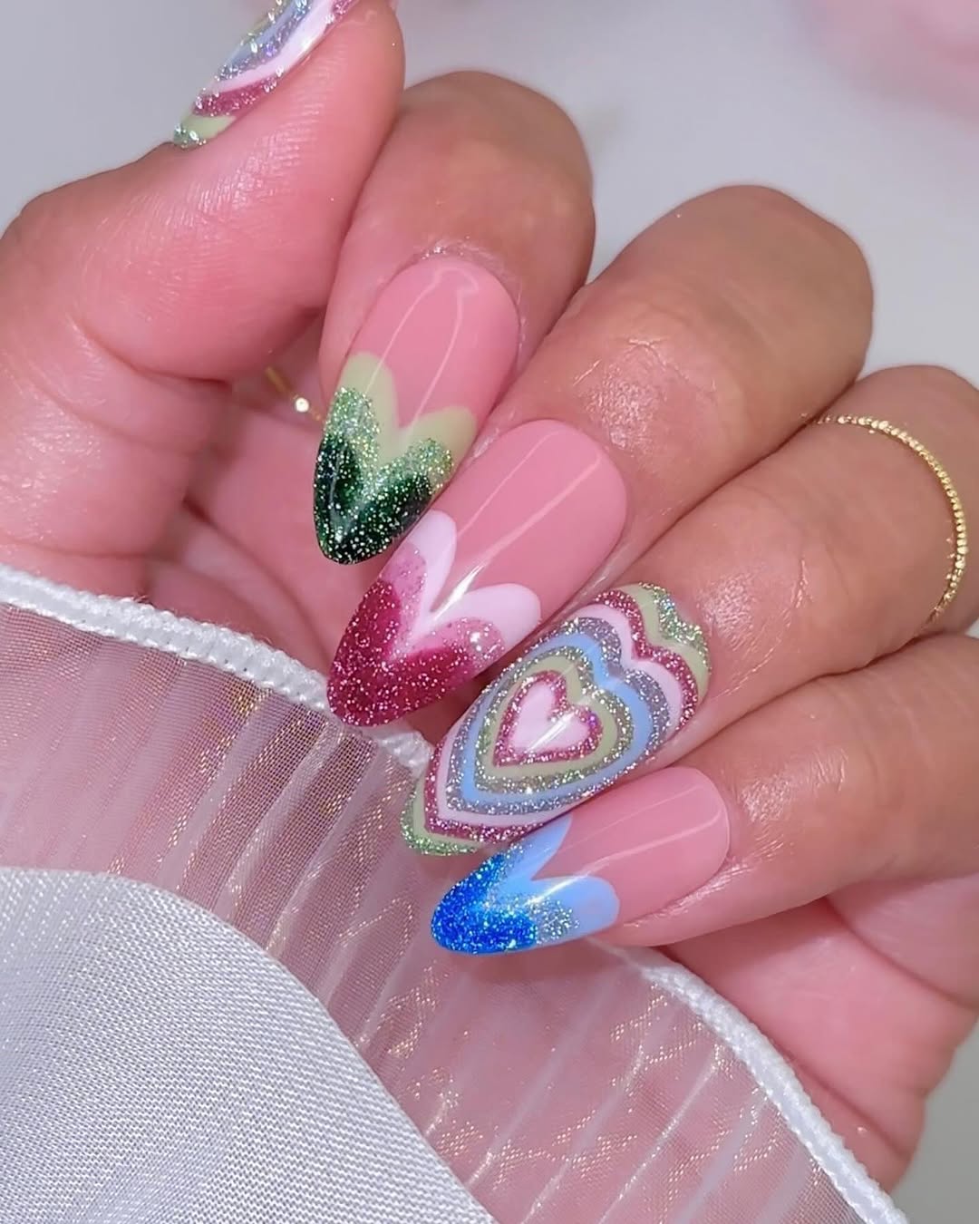 This vibrant set presents a classic French silhouette enhanced with colorful, glittery heart accents, creating a bold yet elegant statement. Each nail feels like a miniature love note, offering a playful and creative expression of the Valentine’s theme. It’s perfect for those who fully embrace the celebratory spirit of the holiday with a mood-lifting and expressive manicure.
