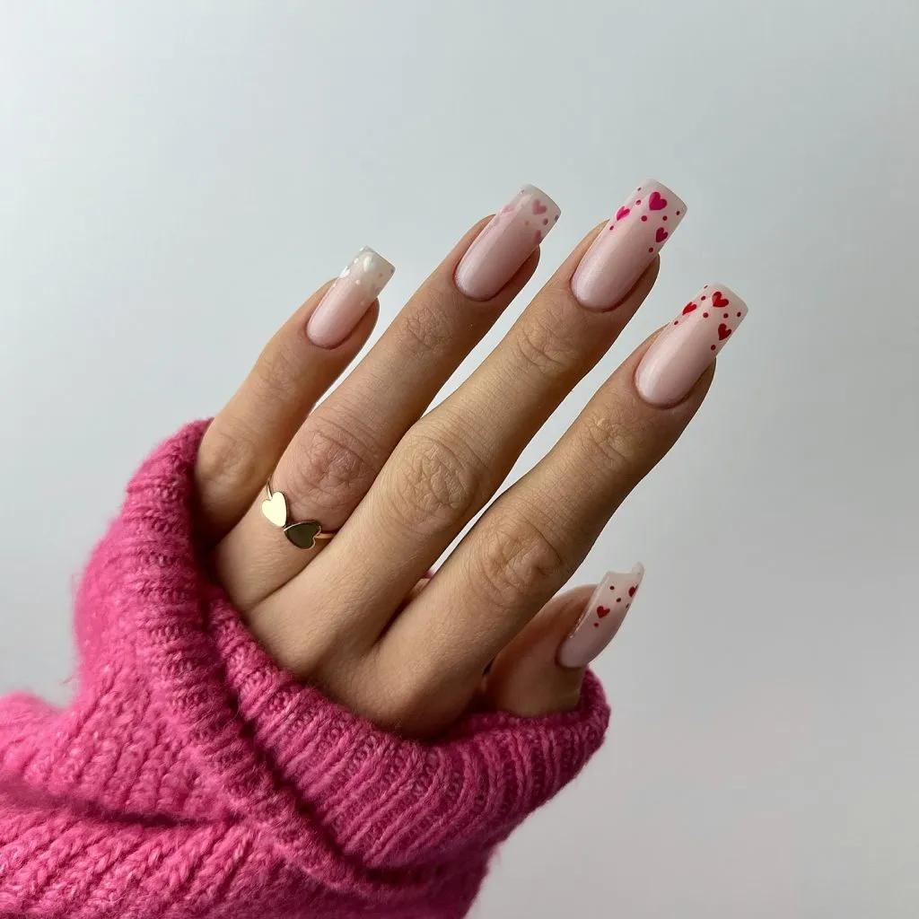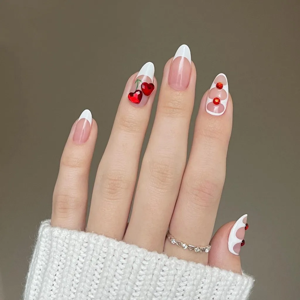 Red French tips are adorned with tiny white polka dots, lending a retro, almost Parisian charm. This design is fun, graphic, and offers a refreshing alternative to typical heart motifs. It’s ideal for those who interpret Valentine’s Day through a fashion-forward lens.
