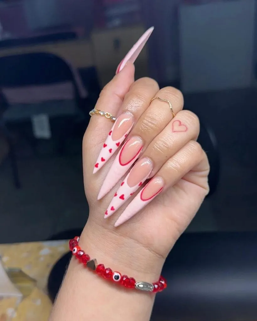 Soft pink stiletto nails adorned with tiny red hearts evoke a dreamy, flirty, and unapologetically cute Valentine’s fantasy. Despite the length and detailed accents, the cohesive color palette keeps the design wearable and refined. This manicure offers a distinct “main character” energy while maintaining an elegant feel.