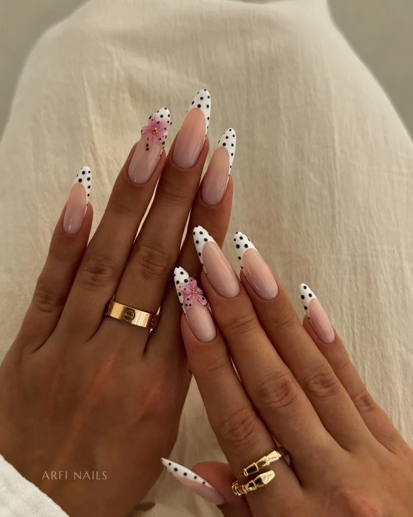 This manicure evokes a romantic Parisian vibe with a soft blush base, clean white French tips, and playful black polka dots. Subtle pink floral details add a touch of romance without being overwhelming, creating a look that is both sweet and polished. Its understated charm makes it perfect for everyday wear, complementing cozy outfits and subtle accessories.
