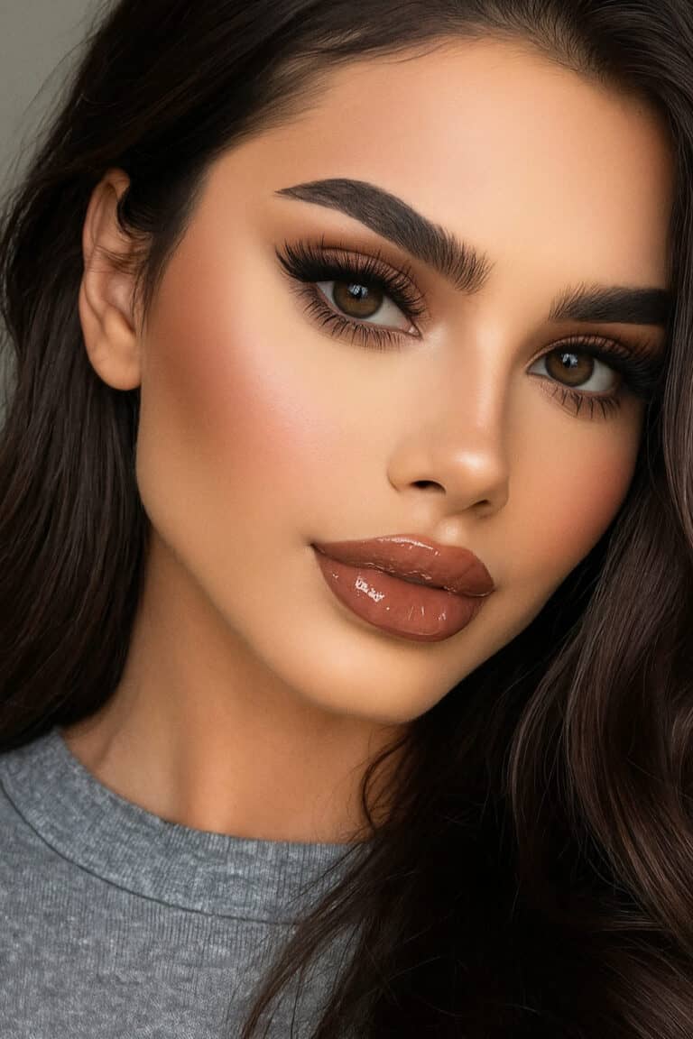 Layer light brown matte shadow all over your lids, deepen the crease with a slightly darker tone, and finish with a touch of shimmer in the center. Pair it with a caramel gloss and peachy blush. It’s subtle, sweet, and super wearable.